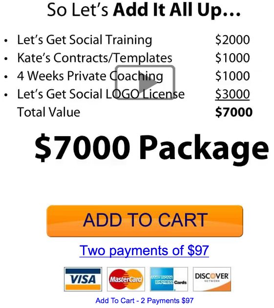 The first three things included in the package are the “Let’s Get Social Training” ($2000 value), “Kate’s Contracts/Templates” ($1000 value), and “4 Weeks of Private Coaching” ($1000 value).