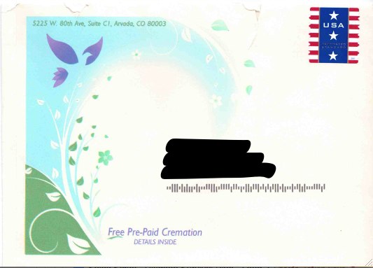 Free Pre-Paid CremationIt was addressed to my father, but it somehow arrived at my house.